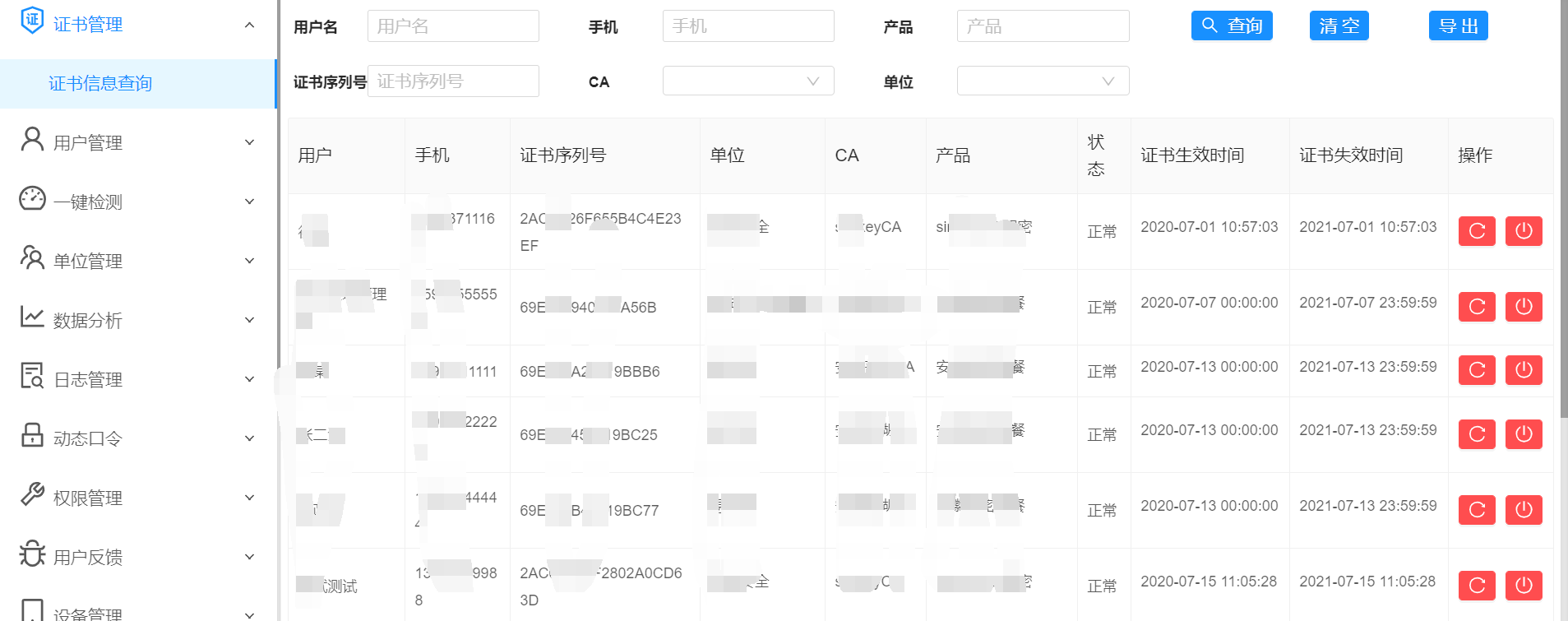 用户管理->编辑用户"、"申请记录->编辑订单"操作会导致证书被注销,此时平台的证书信息被删除,但是卡内的证书仍然存在,需要在发证前先通过"证书管理"删除证书,然后在"首页->申请记录"重新发证。