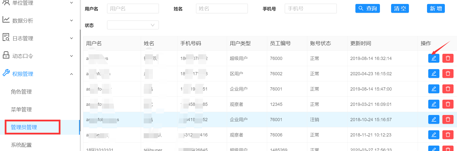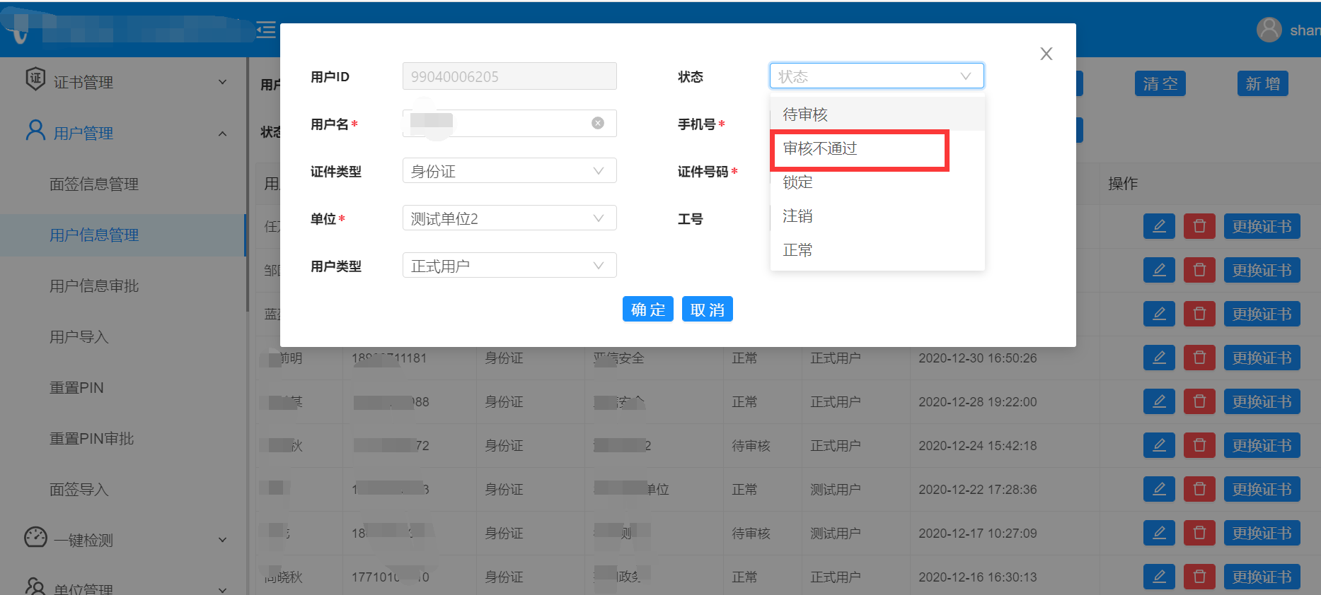 第一步:在平台"用户信息管理"页面将用户信息状态修改为非正常状态(目的是注销丢失卡内的证书);