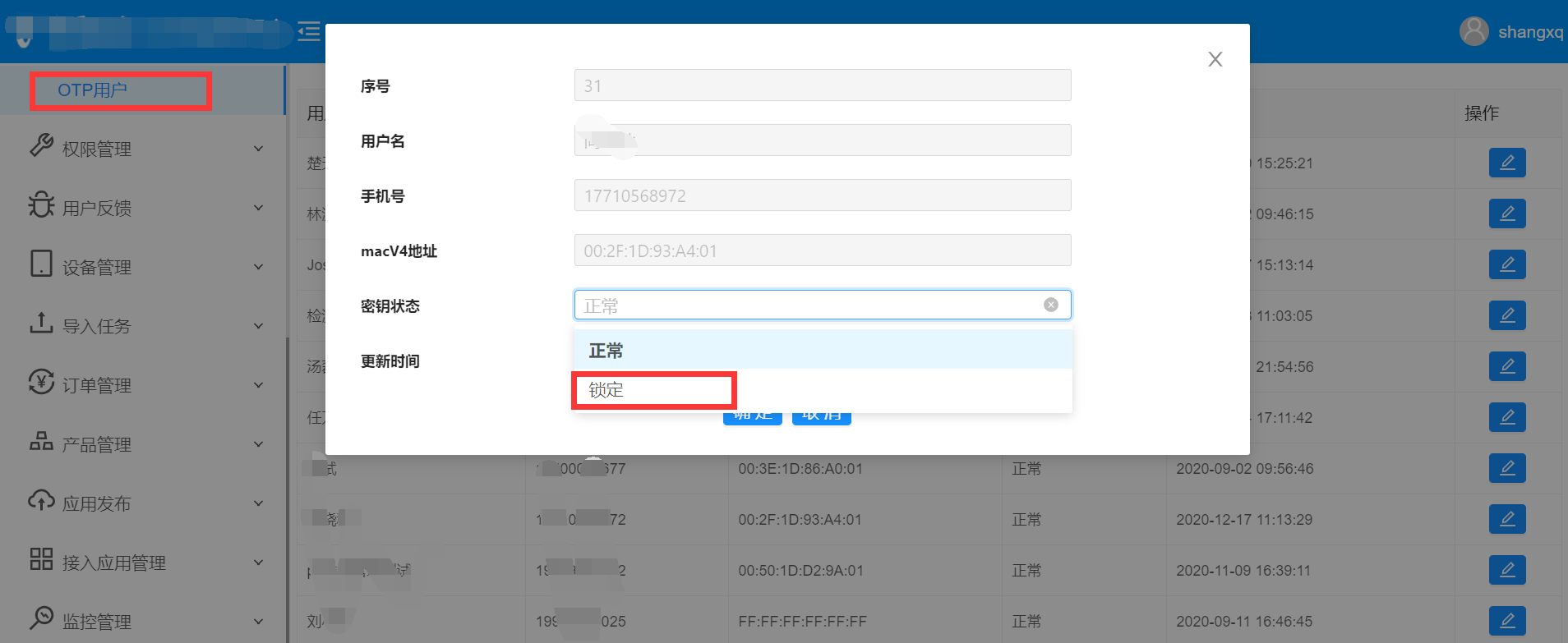 第二步:锁定OTP密钥:在平台的"OTP用户"页面,将用户的状态修改为"锁定"。