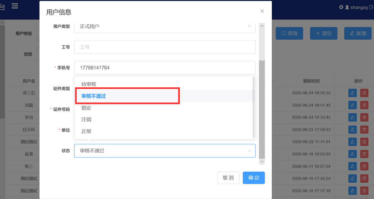 第一步:在平台"用户信息管理"页面将用户信息状态修改为非正常状态(目的是注销丢失卡内的证书);