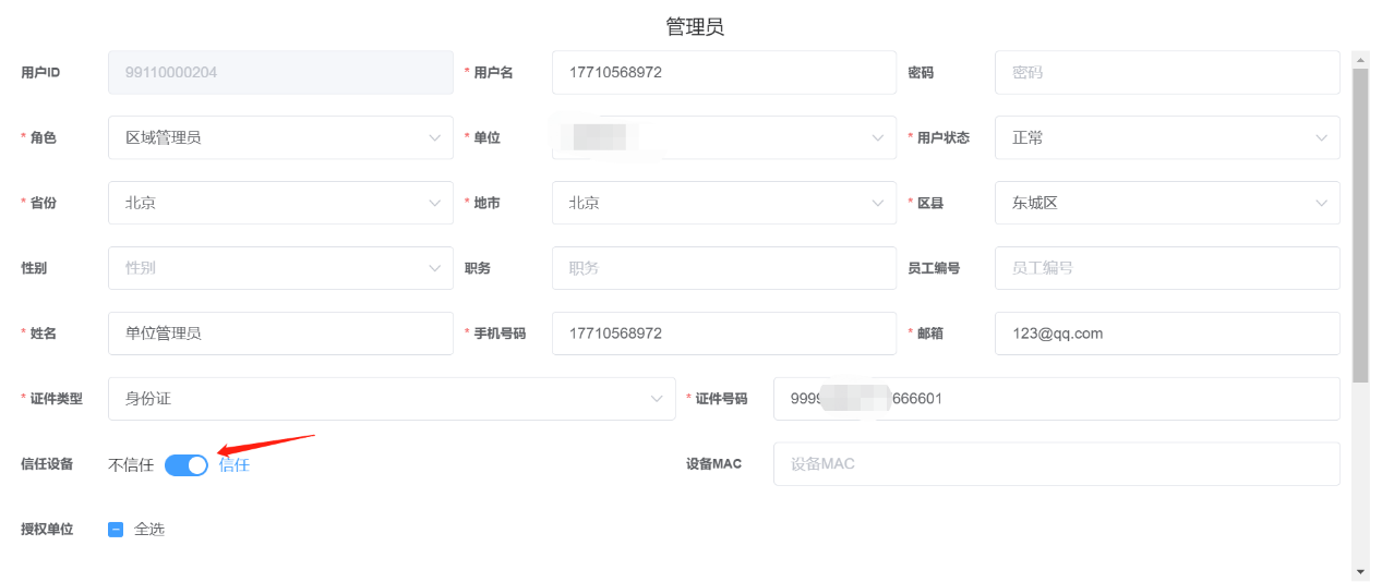 这里的"用户不可信"指的是登录此客户端的管理员不可信,此时登录管理平台,在"管理员管理"项中,选择此管理员,然后进入修改页面,设置"信任设备"为"信任",然后重新操作;